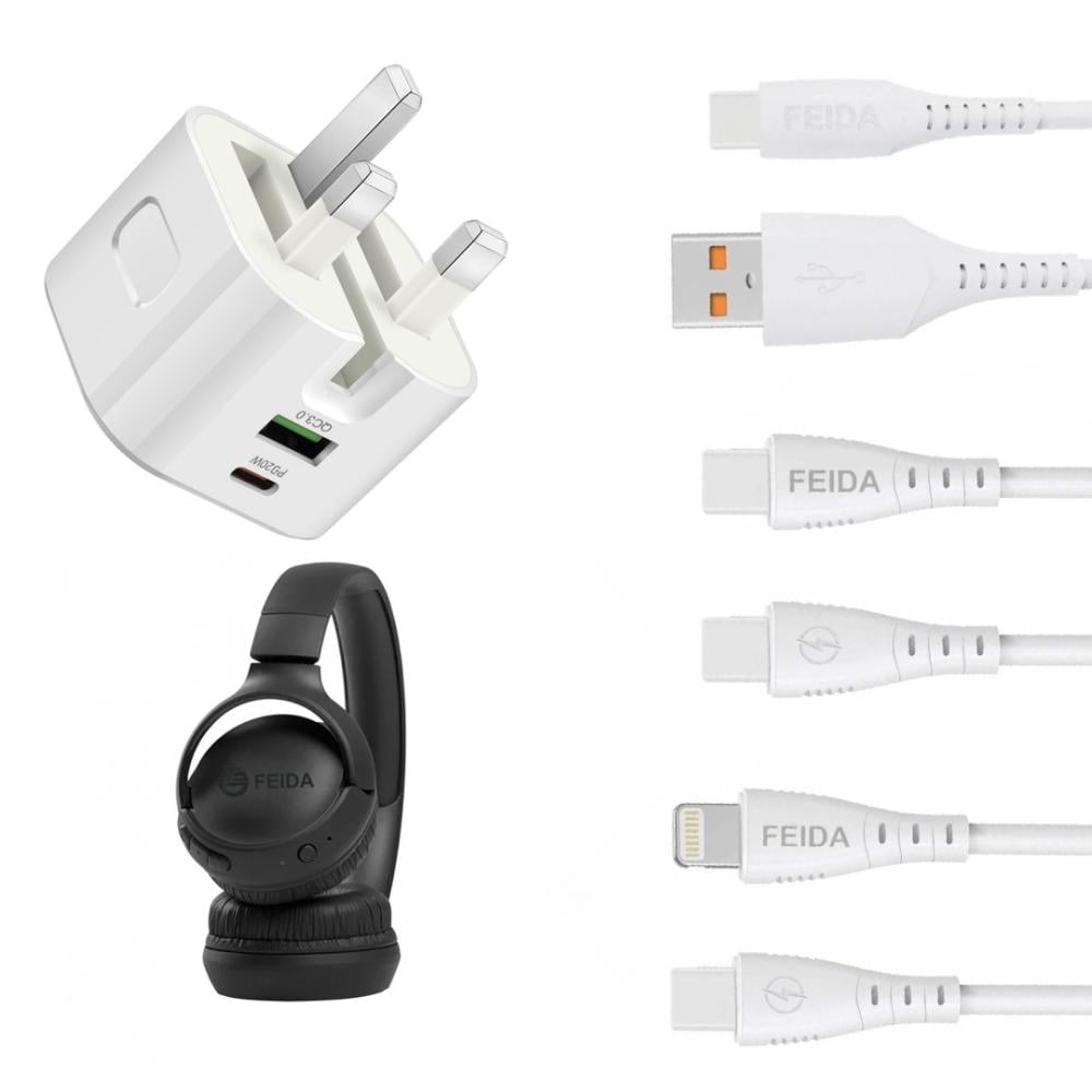بكج سماعة راس فيدا AST78 و كيبل تايب سي USB ومقبس جداري سريع الشحن 20 واط وكيبل تايب سي تو تايب سي وكيبل ايفون تايب سي