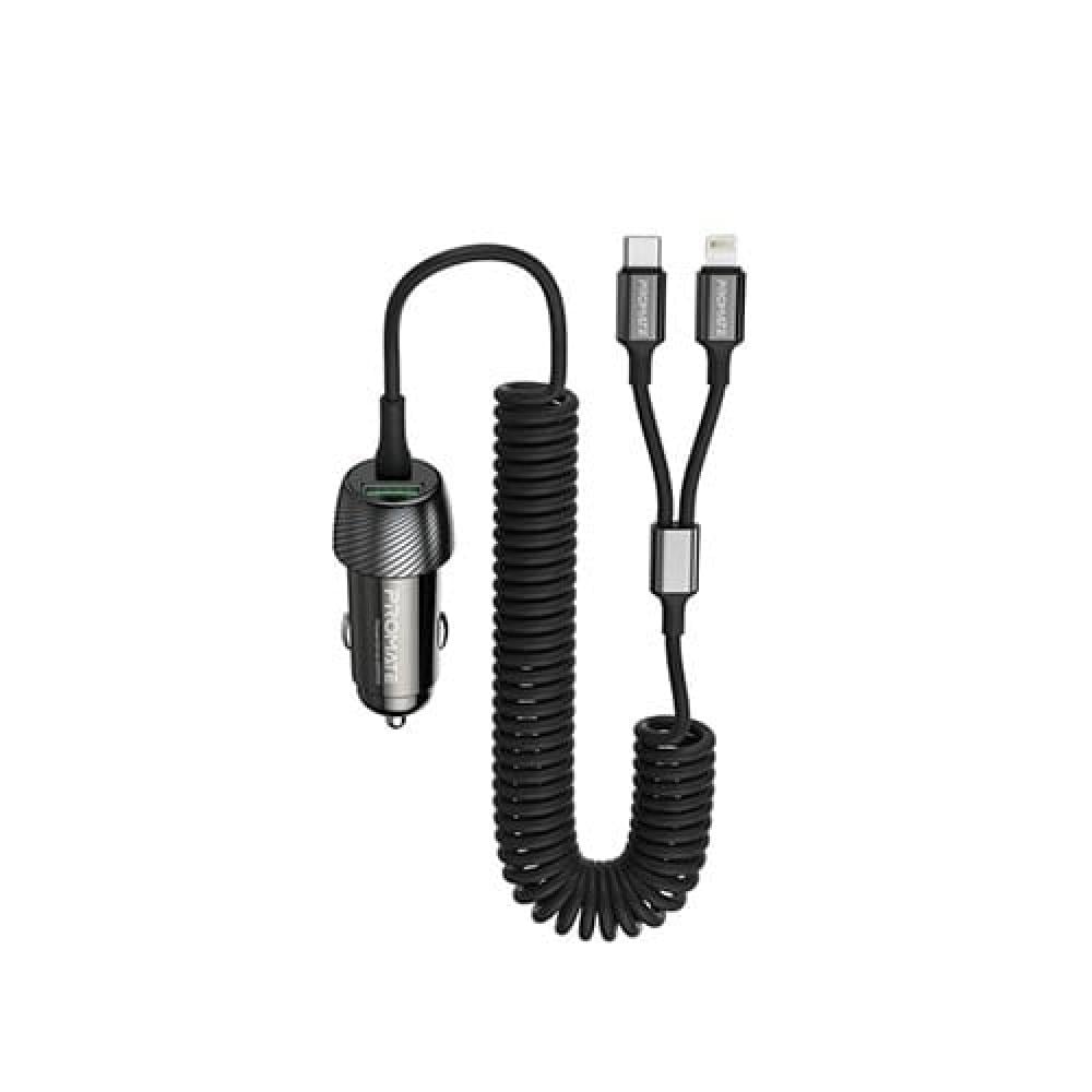شاحن سيارة قوي 33 واط من Promate، مزود بمنفذ 3 في 1 مدمج وملفوف يشمل USB-C™، لايتنينغ، وUSB، لدعم شحن سريع وآمن متعدد الأجهزة بتقنية QC 3.0